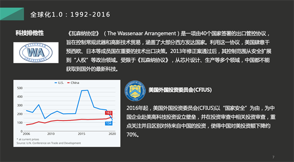 科技排他性看似是一個新的問題,但事實上是也是全球化1.0的重要組成部分。一個典型的例子是瓦森納協定,世界上大部分發達國家都簽署了這一條約,美國能夠通過這一協定,干預包括西歐、日本在內的發達國家的重要技術出口。與此同時,美國的外國投資委員會近些年也越來越活躍,加大了技術封鎖的力度。