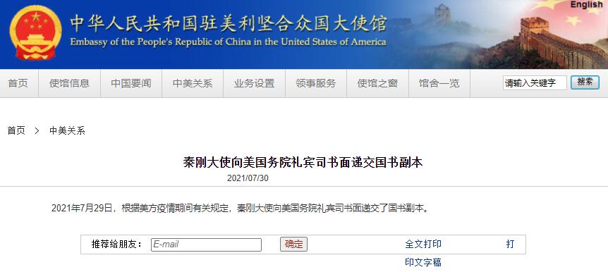 據中國駐美國大使館網站消息,7月29日,根據美方疫情期間有關規定,秦剛大使向美國務院禮賓司書面遞交了國書副本。
