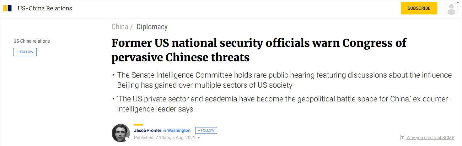 由於美參議院情報委員會通常不舉行公開聽證會,香港《南華早報》形容這是一場“罕見的聽證會”,部分出席會議的美國前國家安全顧問當天警告國會議員、國內投資者、企業和高等學院,必須採取更多措施,“保護美國免受中國政府滲透至各處的影響力行動”。