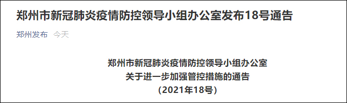 8月6日,“鄭州發佈”微信公眾號發佈《鄭州市新冠肺炎疫情防控領導小組辦公室關於進一步加強管控措施的通告(2021年18號)》。以下為全文: