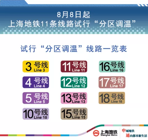 此次試行“分區調温”的地鐵線路分別為3、4、5、10、11、12、13、15、16、17、18號線,共11條線路,而上海地鐵網絡其他線路由於設備能力、技術要求等原因,暫不具備車廂分區調温功能。