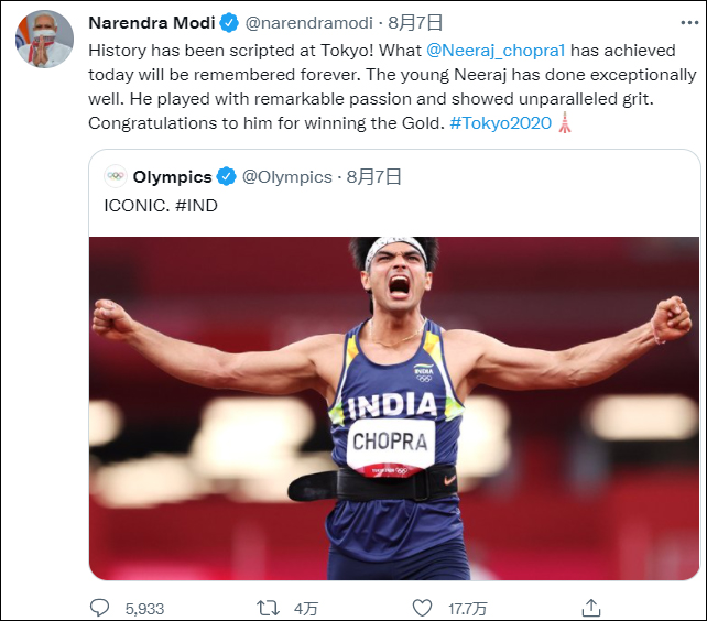 印度總理莫迪也在推特上祝賀他,“歷史在東京改寫!喬普拉今天所取得的成就將被永遠銘記,他展現出了非凡的激情以及無與倫比的毅力。”