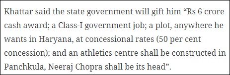 喬普拉所在的哈里亞納邦首席部長還宣佈,獎勵他6千萬盧比獎金(約520萬元人民幣)、一份政府工作、以50%的優惠獲得該邦任何地段的一塊土地,他還將成為該邦即將建成的一體育中心的負責人。