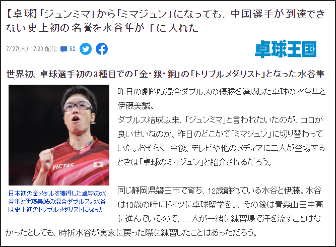 但經觀察者網查證,日本媒體《桌球王國》報道強調,水谷隼是歷史上第一位獲得奧運單打、團體和混雙獎牌的乒乓球手。由於這三塊獎牌正好是金銀銅,所以報道內有所提及。混雙摘銀的劉詩雯/許昕沒有參加奧運單打,所以日媒選擇了這個角度來報道。