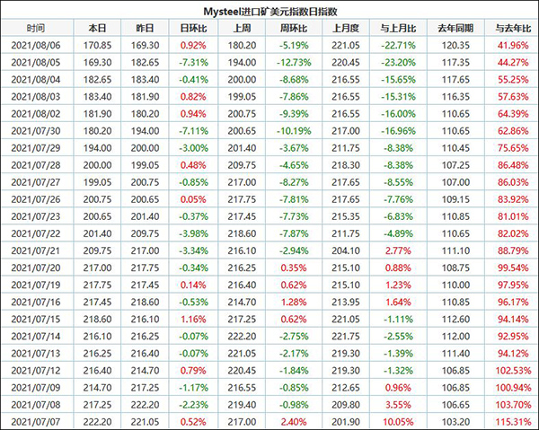 據Mysteel監測數據顯示,截至8月6日,62%鐵礦石價格指數報170.85美元/幹噸,較7月7日222.2美元/幹噸的階段性高點,下跌51.35美元/幹噸。