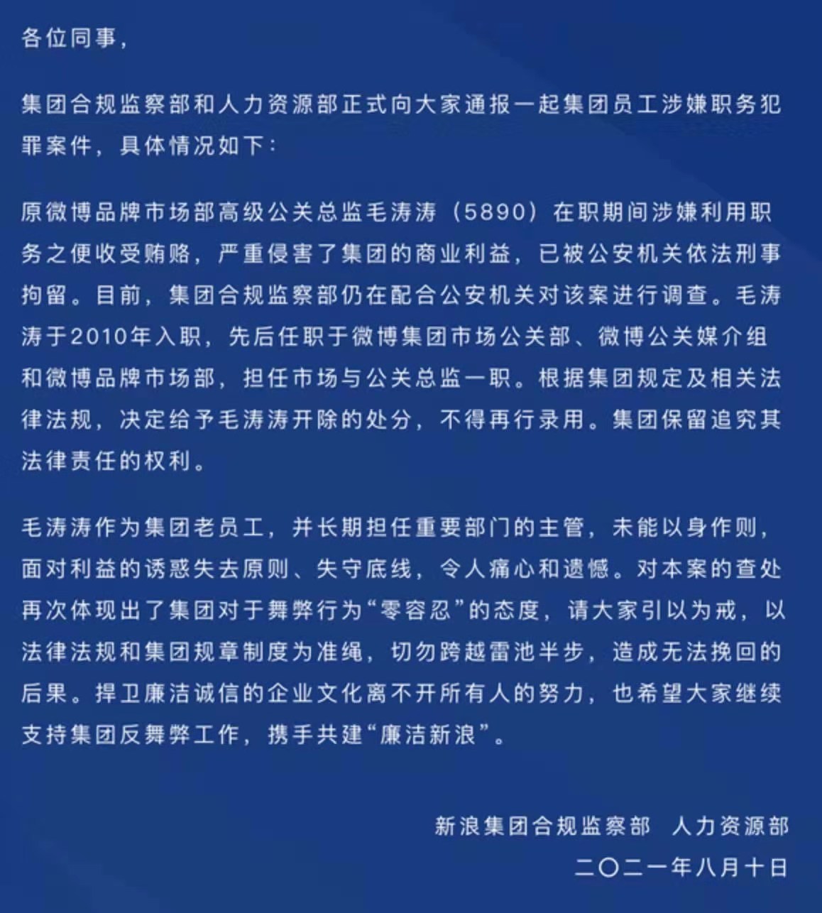 8月10日,新浪集團合規監察部、人力資源部通報了一起員工涉嫌職務犯罪案件,通報稱,原微博品牌市場部高級公關總監毛濤濤在職期間涉嫌利用職務之便收受賄賂,嚴重侵害了集團的商業利益,已被公安機關依法刑事拘留,集團合規監察部仍在配合公安機關對該案進行調查。