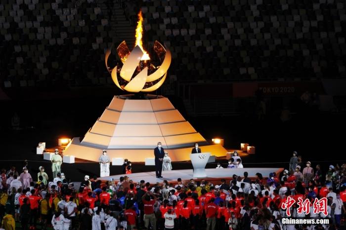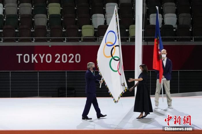 8月8日,第32屆夏季奧林匹克運動會閉幕式在日本東京舉行。圖為國際奧委會主席巴赫(左)在閉幕式會旗交接儀式上將奧林匹克會旗交給巴黎市長伊達爾戈。 中新社記者 杜洋 攝