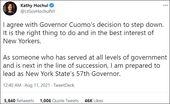 “我同意科莫州長辭職的決定。這是正確的做法,也符合紐約民眾的最大利益。作為在各級政府工作過的人和下一個繼任者,我已經準備好以紐約州第57任州長的身份領導紐約州。”在科莫10日宣佈辭職後,擔任其副手近7年的62歲紐約州副州長凱西·霍楚(Kathy Hochul)發佈推文表態。