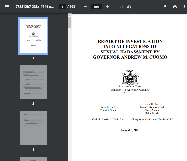 據此前報道,這份報告歷經數月的調查與編寫,採訪了179人,包括曾檢舉科莫的前下屬、州長本人和他身邊的資深顧問團等,共詳細列舉了科莫性騷擾11名女性,違揹他們意願的身體接觸的例子,其中還包括一起之前未公開的案件。