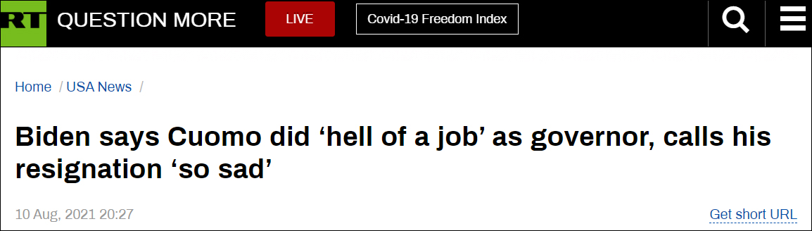 據“今日俄羅斯”(RT)報道,美國總統拜登10日在白宮接受採訪,當被問及對科莫辭職一事作何感想時,他稱“我尊重州長的決定,也尊重他作出的這一決定。”