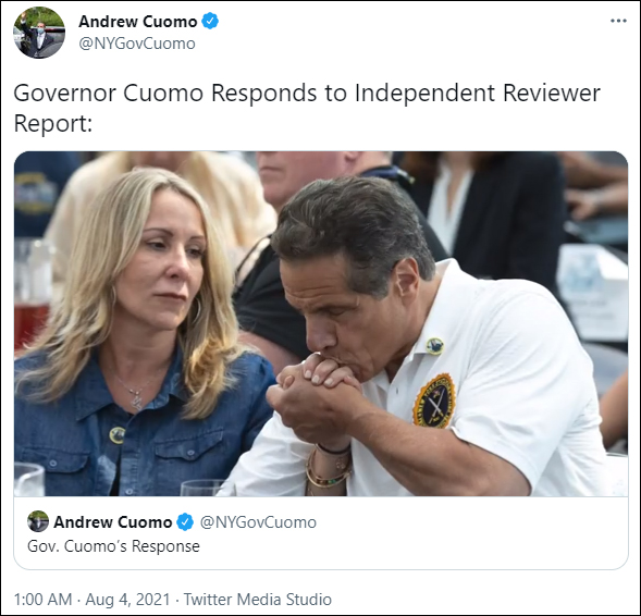 緊接着,各種性騷擾指控接踵而至,其人設一崩再崩,直至8月3日,其形象徹底瓦解,當日,紐約州檢察長萊蒂西亞·詹姆斯(Letitia James)發佈了一份長達168頁的獨立司法調查報告,證實該州州長安德魯·科莫曾性騷擾數十名女性,其中包括多名其前下屬,違反了州和聯邦法律。