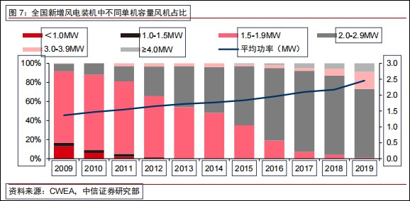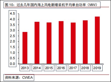 西部證券研報援引通用電氣的測算結果稱,按照中國海域水深25米、風速9米/秒、規模為400MW風電場的情況進行估算,與安裝6MW機組相比,安裝12MW機組每千瓦可降低27.89%的造價成本。而從2007-2019年,我國海上風電的主流機型從1.5MW提升到5-6MW,對應的海上風電造價從2.67萬元/千瓦下降到1.57萬元/千瓦,造價下降41%。
