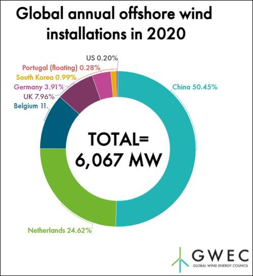 如果再考慮到中國當年新增了3060MW的海風裝機而英國僅新增了483MW,中國今年的登頂確實只是時間問題。GWEC也在今年年初表示,預計中國在2021年將超過英國,成為全球最大的海上風電安裝市場。