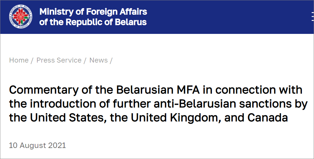 當地時間8月10日,白俄羅斯外交部發表聲明,強烈譴責美國、英國和加拿大單方面制裁,白俄外交部官網截圖。