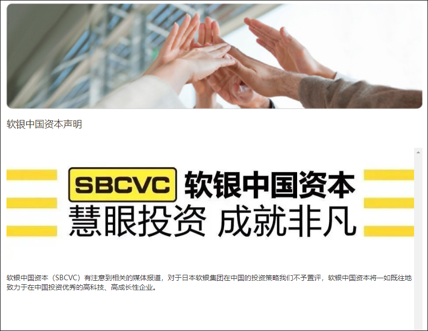 8月11日,軟銀中國資本(SBCVC)官方網站發佈聲明稱,注意到相關的媒體報道,對於日本軟銀集團在中國的投資策略軟銀中國資本不予置評,軟銀中國資本將一如既往地致力於在中國投資優秀的高科技、高成長性企業。