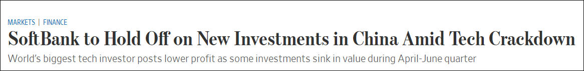 據報道,中國監管機構4月對阿里巴巴處以創紀錄的反壟斷罰款後,阿里的股價自今年2月的高點下跌了近30%。軟銀還是中國網約車巨頭滴滴的最大投資者,滴滴於7月因數據安全問題被處罰後,該公司的股價比在紐交所IPO時的價格低了三分之一。