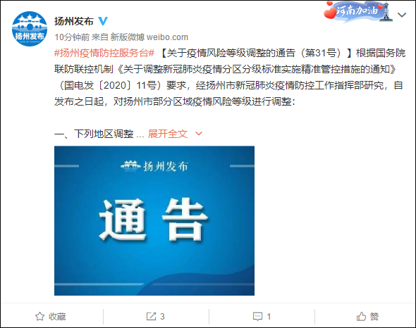 根據國務院聯防聯控機制《關於調整新冠肺炎疫情分區分級標準實施精準管控措施的通知》(國電發〔2020〕11號)要求,經揚州市新冠肺炎疫情防控工作指揮部研究,自發布之日起,對揚州市部分區域疫情風險等級進行調整: