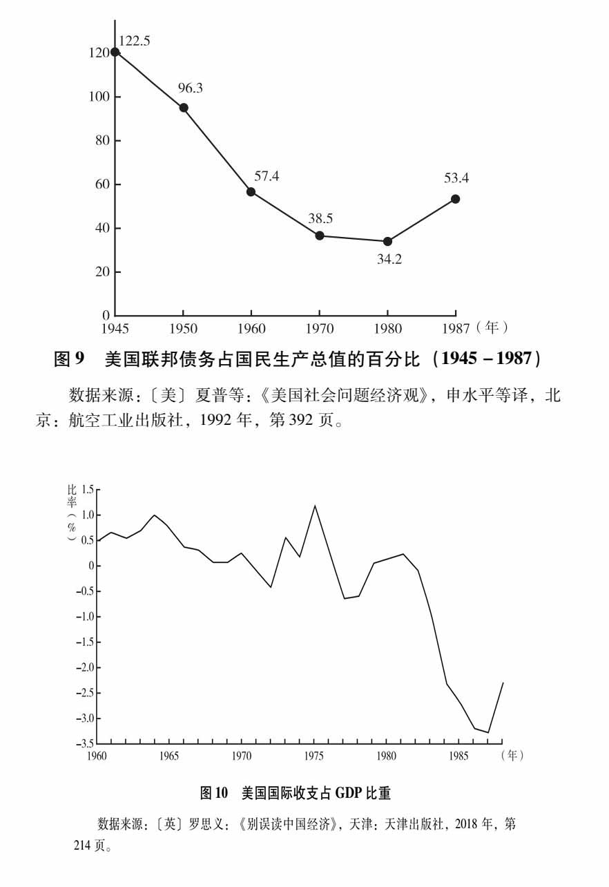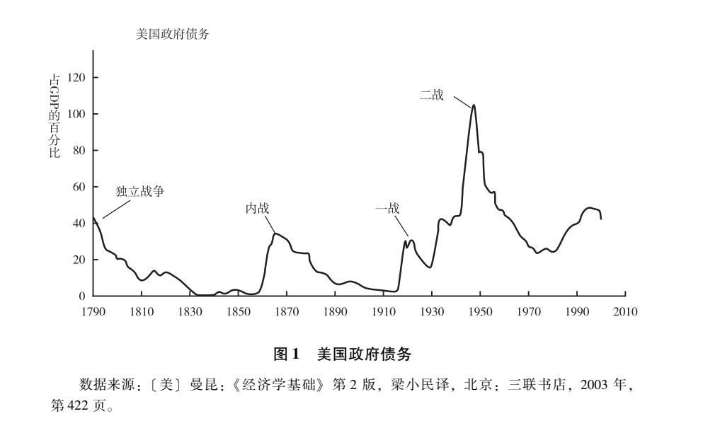 同樣的道理,美利堅民族在建立新國家的時候沒有及時建立由國家獨控的國有銀行既是美國迅速崛起並打敗歐洲的重要原因,也是美國步入世界大國後迅速衰落的主要原因。我們看到,從獨立之日起,美國政府就失去了獨立的財政能力,而銀行的私有化政策又導致政府力量先天不足,重大內政外交政策的實施如果沒有財團同意借款,政府就隨時面臨“財政懸崖”。這導致政府對私人財團的依賴越來越深。從前引美國經濟學家曼昆在《經濟學基礎》提供的《美國政府債務》圖表(參見圖一)可以看出,從獨立戰爭到第一次世界大戰,美國政府的債務與佔國內生產總值的比例一直保持30%~40%之間,到第二次世界大戰期間這個比例迅速突破100%18。這説明,在美國面臨着歐洲壓迫的時候,擺脱這種壓迫會得到全美各階級的支持,這時的美國政府會有比單純的國有銀行更強大的融資能力,這種能力是美國迅速打敗歐洲霸權的前提。但是,當美國打敗歐洲,在第二次世界大戰後成為世界霸權之後,美國的借債水平就成為政府對金融財團的依賴深度的標尺。