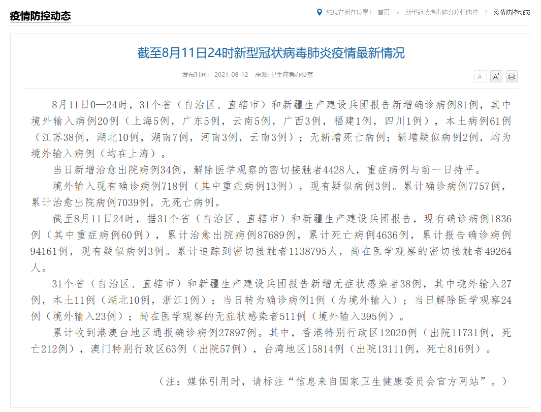 據國家衞健委網站消息,8月11日0—24時,31個省(自治區、直轄市)和新疆生產建設兵團報告新增確診病例81例,其中境外輸入病例20例(上海5例,廣東5例,雲南5例,廣西3例,福建1例,四川1例),本土病例61例(江蘇38例,湖北10例,湖南7例,河南3例,雲南3例);無新增死亡病例;新增疑似病例2例,均為境外輸入病例(均在上海)。