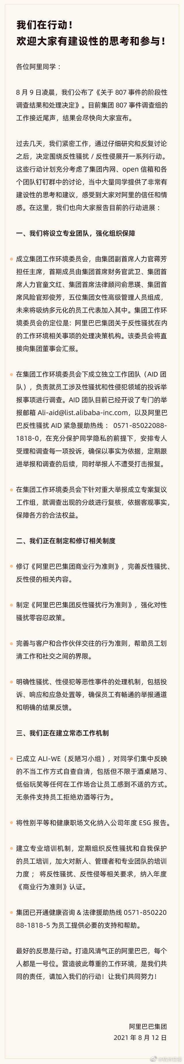 (觀察者網訊)8月12日,阿里巴巴集團公佈了推動反性騷擾的機制化工作進展,這項內部全員公告包括四方面的行動。