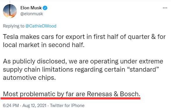 隨後,特斯拉CEO埃隆·馬斯克(Elon Musk)回應稱,特斯拉中國在本季度前半段為出口製造汽車,後半段為中國本地市場生產汽車。他還補充道,“正如公開披露的那樣,我們在某些‘標準’汽車芯片方面的供應鏈受到極大的限制。到目前為止,問題最多的是瑞薩(Renesas)和博世(Bosch)。”