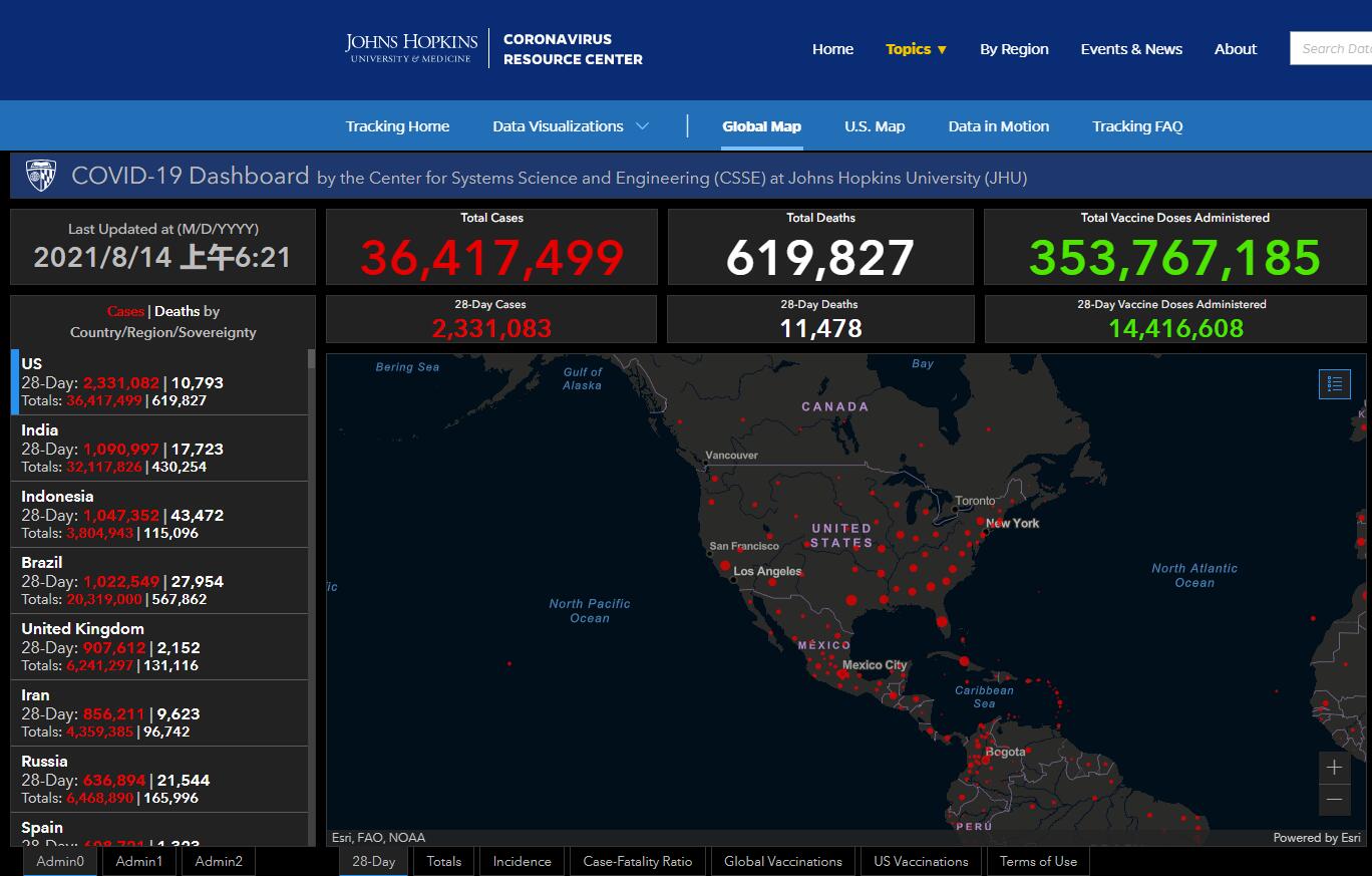 (觀察者網訊)根據美國約翰斯·霍普金斯大學統計數據,截至北京時間2021年8月14日6時21分,美國新冠肺炎累計確診病例達到36417499例,累計死亡病例619827例。在過去約24小時裏,美國新增確診病例90790例,新增死亡病例642例。