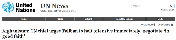 古特雷斯呼籲塔利班“以阿富汗及其人民的利益為重”,停止對阿富汗政府軍的進攻並回到談判桌上來,“只有阿富汗人主導的政治談判才能確保長久的和平”。他表示,聯合國將繼續為達成和平協議做出努力,促進阿富汗人的權利並向平民提供人道主義幫助。