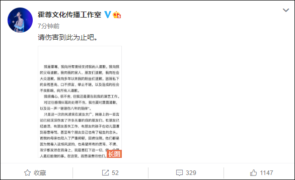 霍尊向其家人、朋友、粉絲等道歉,並表示,“請傷害到此為止吧”。