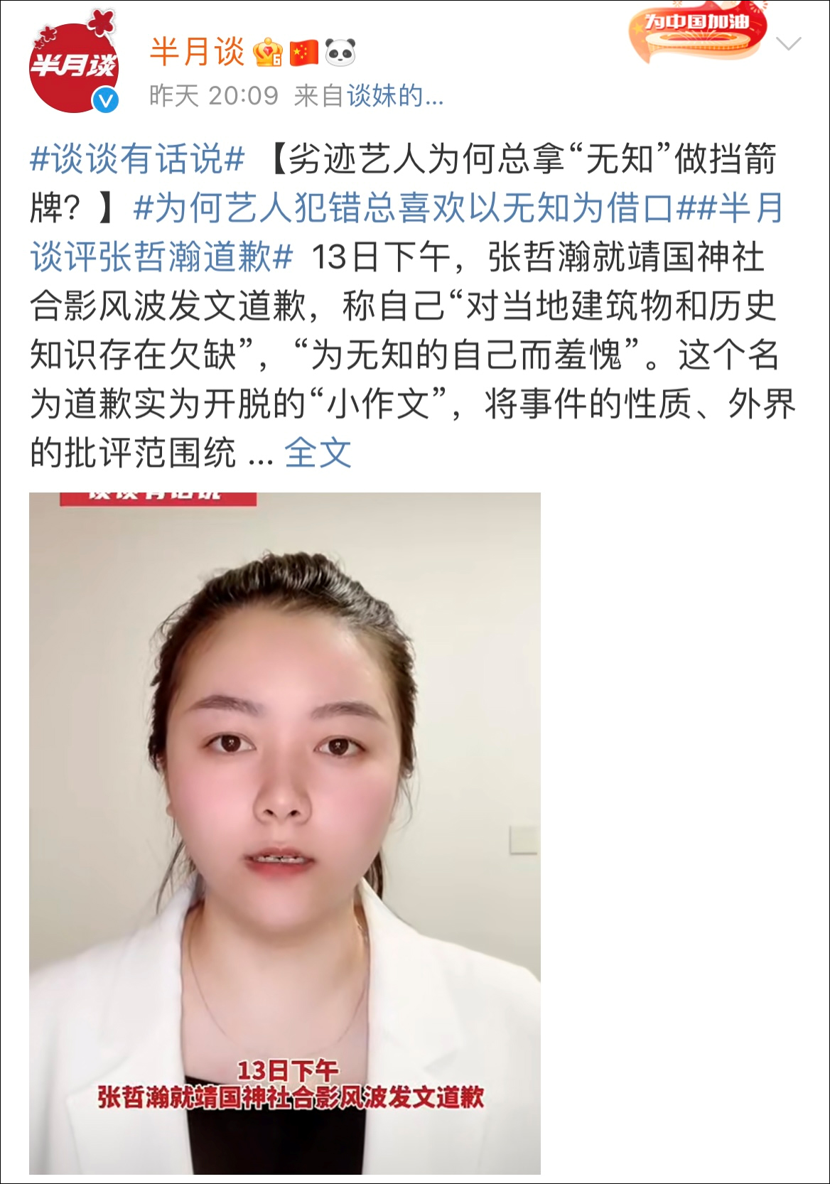 昨天下午,新華社下屬官方雜誌社《半月談》評論張哲瀚的道歉,“劣跡藝人為何總拿‘無知’做擋箭牌?”