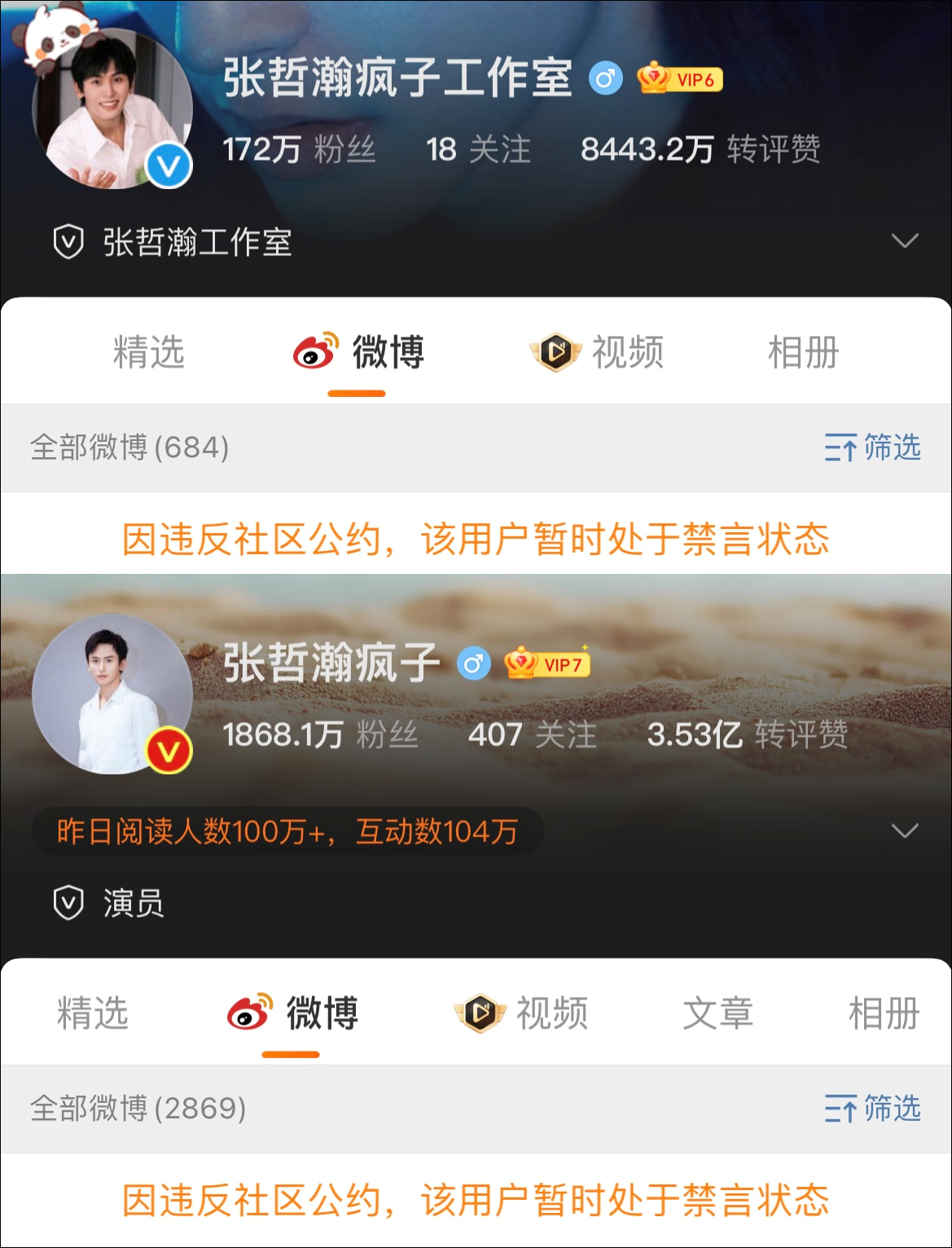 今天上午,張哲瀚的個人微博和工作室微博均顯示“因違反社區公約,暫時處於禁言狀態”。