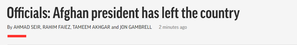 阿富汗黎明新聞台(TOLO News)、美聯社與路透社等多家媒體報道,阿富汗總統加尼已經離開阿富汗國內,與加尼一同離開阿富汗的還有阿富汗總統國家安全顧問哈姆杜拉·穆希卜(Hamdullah Mohib)和另一名“親密夥伴”。