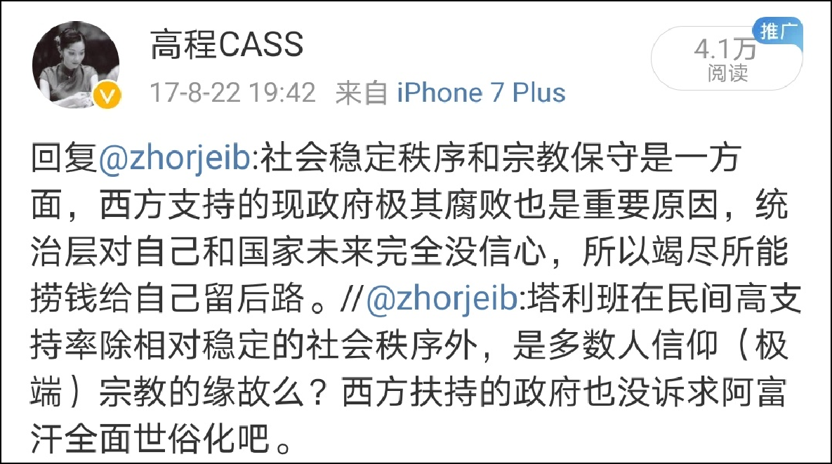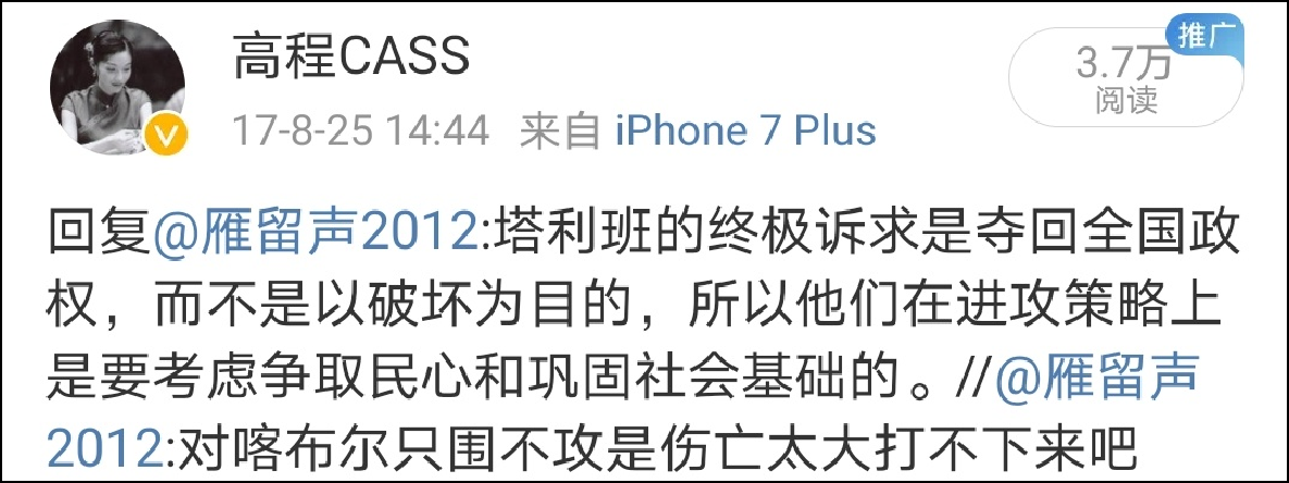 @高程CASS 發佈的微博截圖顯示,早在2017年8月22日,她就預測美軍撤離阿富汗後,“塔利班推翻美西方扶持的現政府重掌阿富汗估計一兩個月的事”,“阿國多數人支持塔利班而非現政府”。