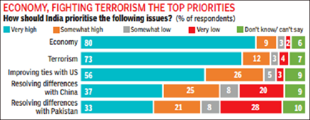 然而,絕大多數人認為,印度外交政策的首要任務應該是經濟復甦,並對印度退出“區域全面經濟夥伴關係協定”(RCEP)表示反對。其他優先事項包括打擊恐怖主義、網絡安全以及中印對峙問題。