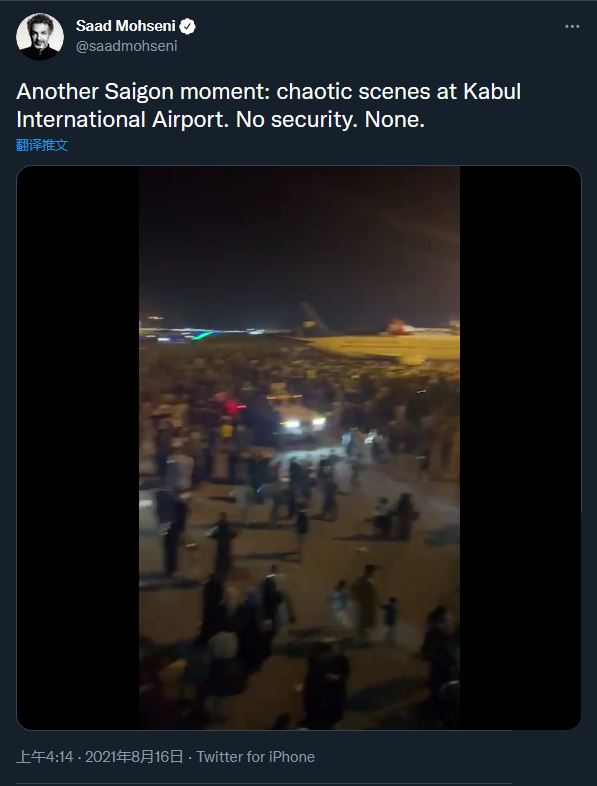 他在這條推特配文寫道:“另一個西貢時刻,喀布爾國際機場的混亂場景,沒有安保,沒有。”