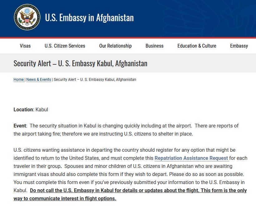 此外這份聲明中還提到,任何想要離開阿富汗的美國公民,都必須填寫一份“遣返歸國援助申請”(Repatriation Assistance Request)。而那些非美國籍的美國公民配偶和未成年人子女,也需填寫這份表格。