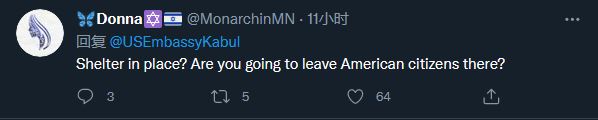 稍早之前,美國駐喀布爾使館發佈安全提醒,稱機場有交火,美國公民需“就地避難”,還要填寫一份表格。美國政府緩慢甚至帶些“官僚主義”的應對,已經招致本國公民的不滿,更有數萬名為美國政府工作的阿富汗人,困在喀布爾。