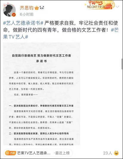 隨後,芒果TV藝人楊爍、李莎旻子、佟夢實、丁當、齊思鈞等人也發佈了該承諾書。