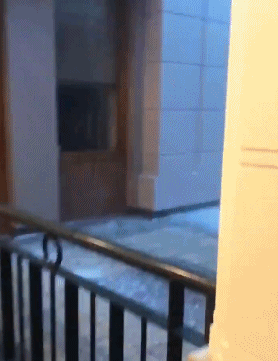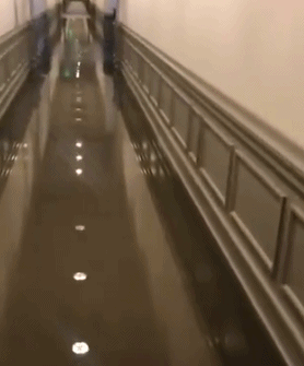 據社交媒體上的視頻顯示,大量雨水從大廈的天窗灑下,走廊裏的積水已經可以沒過腳踝。