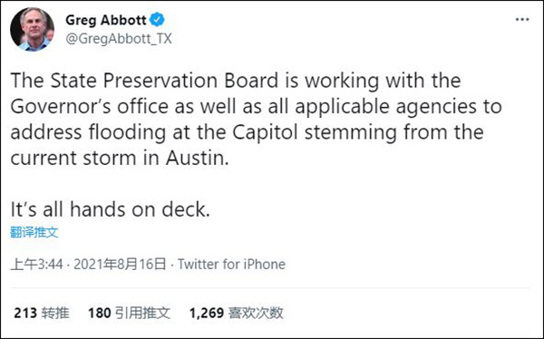而得州州長、共和黨人格雷格·雅培(Greg Abbott)依然在推特上稱,“正對州議會大廈內的洪水採取‘全力以赴’(all hands on deck)的應對措施。”