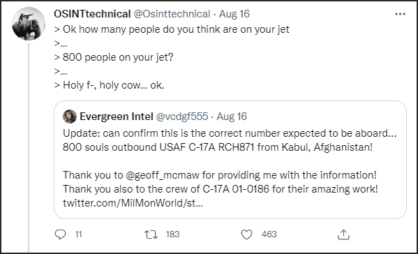 一名軍官透露,這架呼號是Reach 871的C-17原本沒有搭載這麼多人的計劃,但是驚慌失措的阿富汗人紛紛爬上快要關閉的活動梯。
