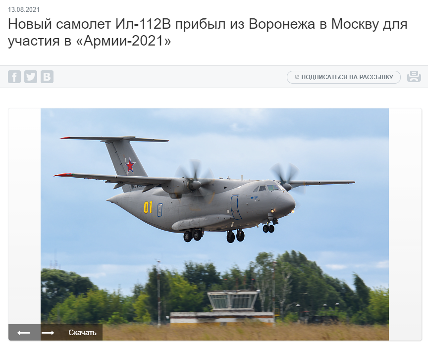 伊爾-112V是伊爾-112運輸機的最新型號,該機型在2019年3月進行了首飛,之後又進行了一系列改造。今年8月13日,俄羅斯聯合飛機公司(UAC)曾宣佈,俄羅斯最新型伊爾-112V軍用運輸機第一架原型機已飛往莫斯科附近的茹科夫斯基市,並將在第七屆“軍隊2021”國際軍事技術論壇(8月22日-28日)上進行公開展示。