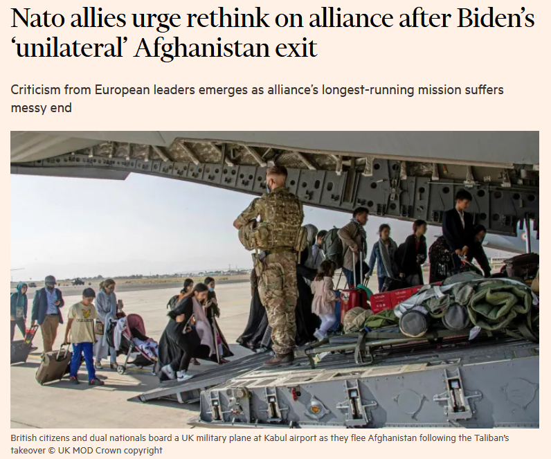 “看來北約已經完全被美國的單邊決定所取代了。”英國前國家安全顧問彼得·裏基茨(Peter Ricketts)抱怨道,雖然阿富汗行動總有結束的時候,不會永遠持續下去,但“撤軍的方式對北約造成了羞辱和傷害”。