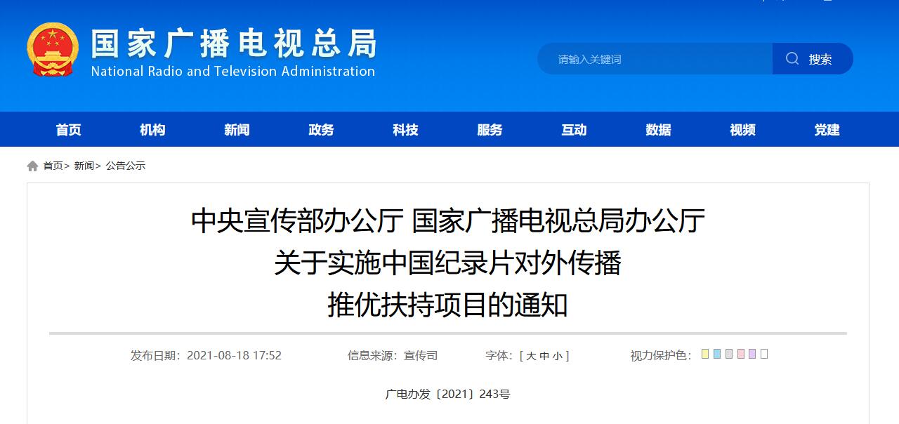 據國家廣播電視總局網站8月18日消息,為深入學習宣傳貫徹習近平新時代中國特色社會主義思想和黨的十九大及十九屆二中、三中、四中、五中全會精神,貫徹落實黨中央關於加強和改進國際傳播工作的重要指示,充分發揮優秀國產紀錄片在跨文化、跨語境、跨國界傳播中的獨特優勢,引導廣播電視製作播出機構進一步守正創新,創作推出更多適合國際傳播的優秀紀錄片,2021年起,中央宣傳部、國家廣播電視總局將聯合實施中國紀錄片對外傳播推優扶持項目,每季度對取得較好國際傳播效果的優秀國產紀錄片予以扶持獎勵,加快推動國產紀錄片“走出去”,向世界講好中國故事,傳播好中華文化,展示真實、立體、全面的中國。現將有關事項通知如下: