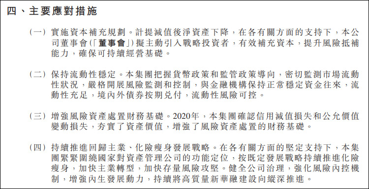 爆出鉅額虧損後,中國華融拿出4點主要應對措施: