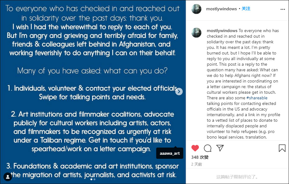 16日,瑪麗亞姆·加尼在Instagram上發帖稱,她“為留在阿富汗的家人、朋友和同事感到憤怒、悲傷和害怕”,並稱她“正在瘋狂地工作,為他們做任何我能做的事情。”