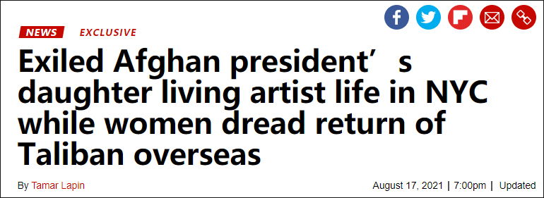 文章稱,“雖然阿富汗婦女對塔利班壓迫統治的迴歸感到恐懼,但該國流亡總統阿什拉夫·加尼(Ashraf Ghani)的女兒在紐約過着藝術家的生活。”