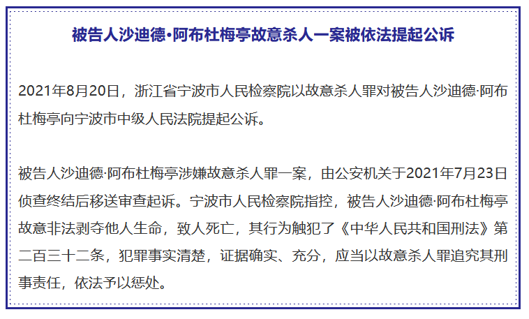 據“浙江檢察”微信公眾號消息,2021年8月20日,浙江省寧波市人民檢察院以故意殺人罪對被告人沙迪德·阿布杜梅亭向寧波市中級人民法院提起公訴。