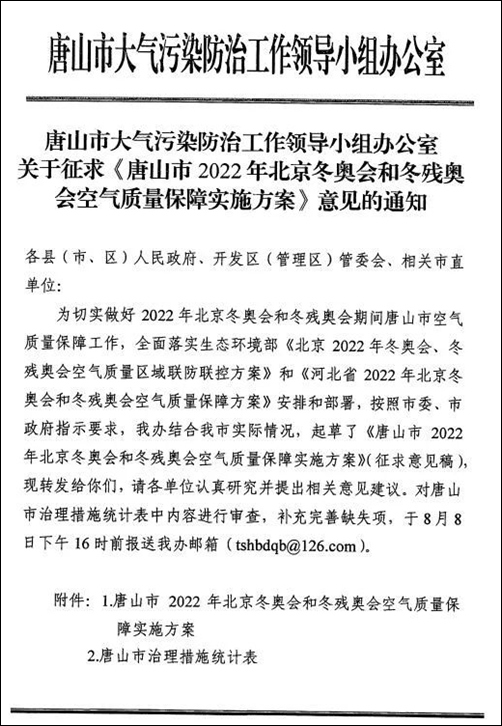 8月初,唐山市大氣污染防治工作領導小組辦公室發佈關於徵求《唐山市2022年北京冬奧會和冬殘奧會空氣質量保障實施方案》意見的通知。圖自期貨日報