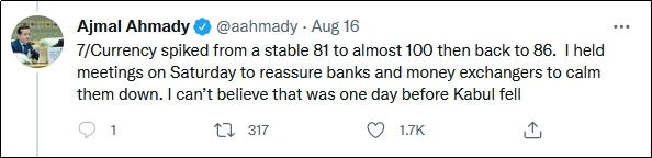 到了週日,艾哈邁迪離開央行大樓前往機場,在那裏他見到了阿富汗政府的其他領導人。他寫道,航班上有300多名乘客,但那架飛機上沒有燃料,也沒有飛行員。艾哈邁迪指出:“事情本不必以這種方式結束。我對阿富汗領導人缺乏計劃感到厭惡。”