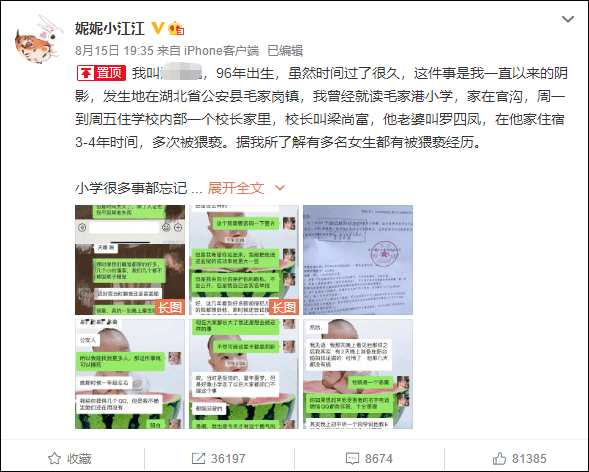 此前,微博備註為“女子實名舉報小學時遭校長猥褻事件當事人”的@妮妮小江江 發佈多條微博,實名舉報曾遭所就讀的毛家港小學的校長猥褻,還稱多名女生都有被猥褻經歷,目前,她已向公安機關報警。